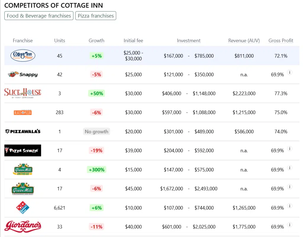 | Cottage Inn Pizza | $216,000 to $500,000 |