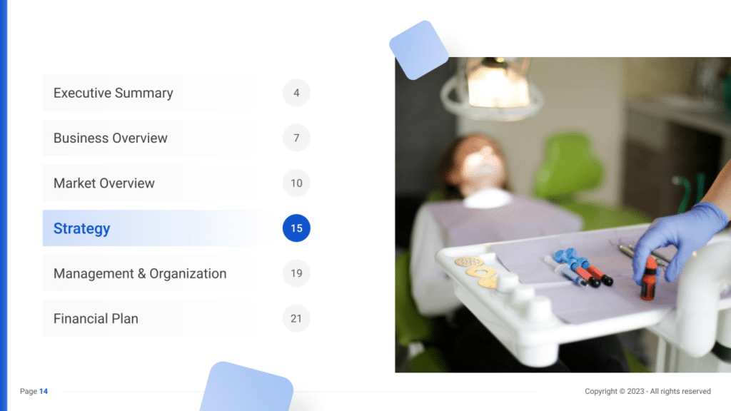 - Executive Summary: A concise overview of your dental practice, showcasing the business concept, market positioning, leadership team, and a snapshot of financial plans.