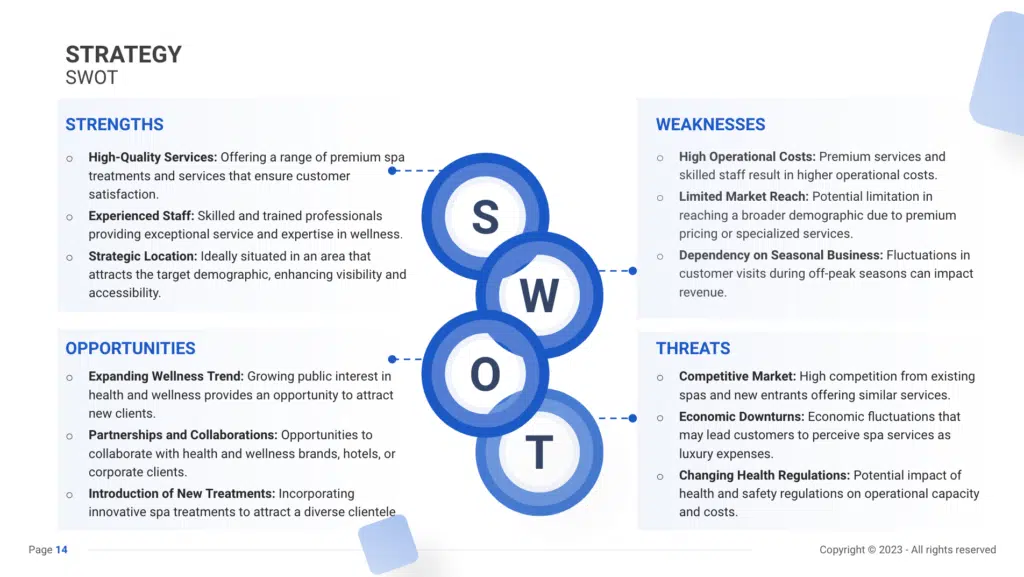 When crafting a business plan for a massage therapy spa, integrating a SWOT analysis is a crucial element. SWOT, which stands for Strengths, Weaknesses, Opportunities, and Threats, is a structured approach that aids spa owners in examining their business from various perspectives.